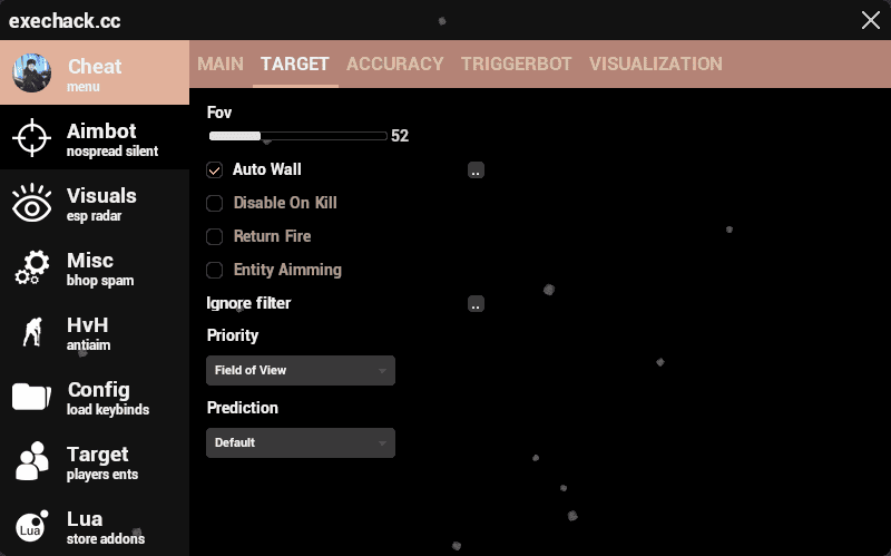 Silent, HitScan, Ignore filter, Priority Filter, Predict Customization, Target Lock, Disable on Kill, Fov Check, Triggerbot, Smooth Aim, Snapline, Legit-mode under observation.